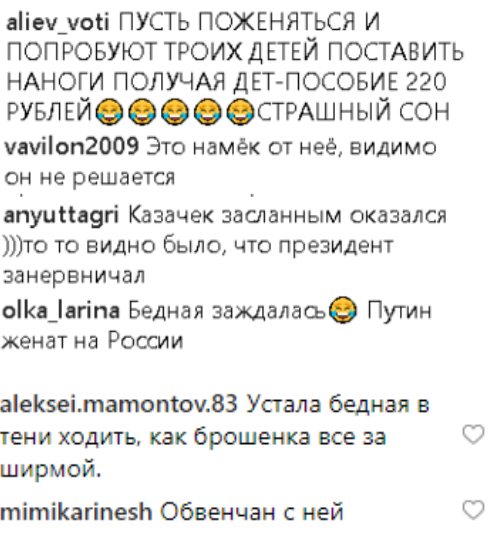 «Пусть поженятся и попробуют троих детей поставить на ноги, получая дет-пособие 220 рублей. Страшный сон», «Это намёк от неё, видимо он не решается», «Казачек засланным оказался. То то видно было, что президент занервничал», «Бедная заждалась. Путин женат на России», «Устала бедная в тени ходить. Как брошенка, все за ширмой», — пишут в комментариях.