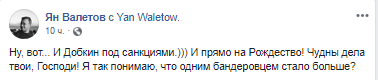 "Ну, вот... И Добкин под санкциями.))) И прямо на Рождество! Чудны дела твои, Господи! Я так понимаю, что одним бандеровцем стало больше?", - написал блогер.