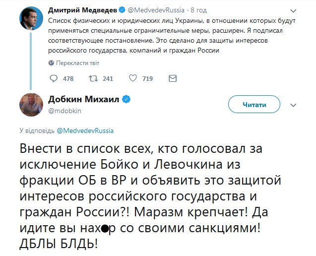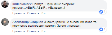 "Ну, послать Медведева - это не значит стать бандеровцем)))", "Ржака реальная. Включая коммент самого потерпевшего", "Как смешно. Похоже, жизнь налаживается", "Значит Добкин не выполнил какое-то поручение важное для кремля. За это и наказан", - пишут комментаторы.