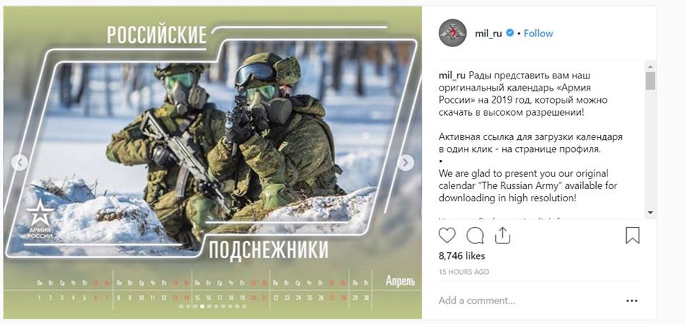 "Рады представить вам наш календарь "Армия России" на 2019 год", - говорится в сообщении.