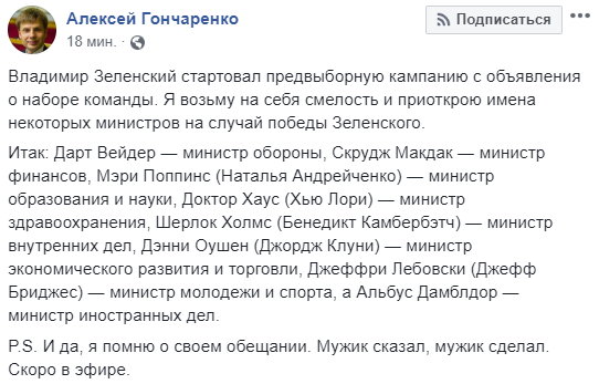 Также Гончаренко в шуточной форме озвучил имена некоторых министров, которые, по его мнению, будут назначены в случае победы Зеленского: "Итак: Дарт Вейдер - министр обороны, Скрудж Макдак - министр финансов, Мэри Поппинс (Наталья Андрейченко) - министр образования и науки, Доктор Хаус (Хью Лори) - министр здравоохранения, Шерлок Холмс (Бенедикт Камбербэтч) - министр внутренних дел, Дэнни Оушен (Джордж Клуни) - министр экономического развития и торговли, Джеффри Лебовски (Джефф Бриджес) - министр молодежи и спорта, а Альбус Дамблдор - министр иностранных дел", - отметил депутат БПП.