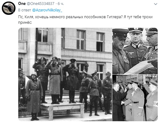 "Правда, Бандера у Гитлера в концлагере сидел, ну это мелочи, не обращай внимания, старик, продолжай жечь ядерным ураганом", - прокомментировал пост украинский журналист Денис Казанский.