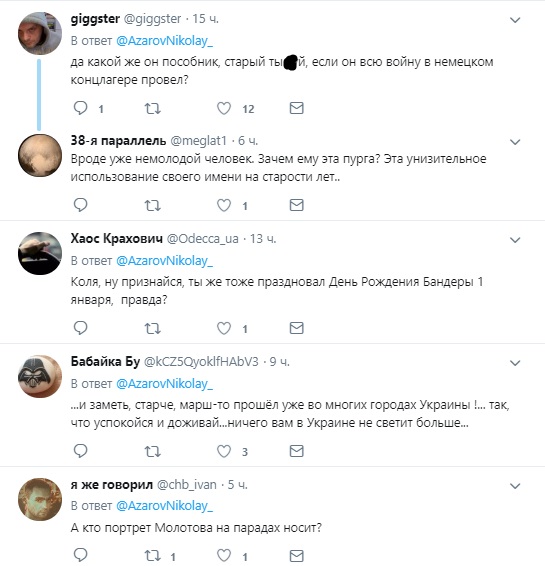 "Та нужен вам наш Бандера!? Своими б "героями" занялись. Власовым, Шкуро, Красновым, например", "У кровосиси обострение. Поставьте деду наконец клизму", "С Бандерой у нас есть будущее. А твое будущее в рашке ,где вылизывают пособника Гитлера-Сталина и головореза Кадырова", "Обострение? Однозначно. Это уже тяжелая форма. Янович, если бы вы были сейчас в Украине, вас могли бы вылечить, благо есть специалисты, легко вправляют мозговые завихрения", - пишут комментаторы.