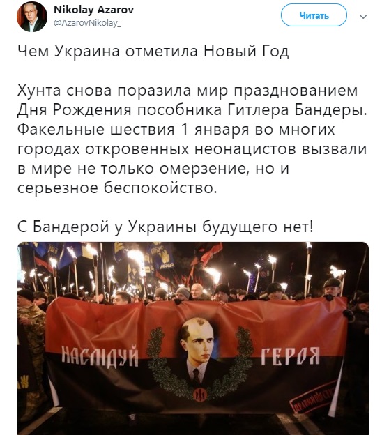 Бежавший в Россию экс-премьер Украины Николай Азаров выдал пост о прошедшем в Киеве 1 января традиционном марше националистов ко дню рождения Степана Бандеры.