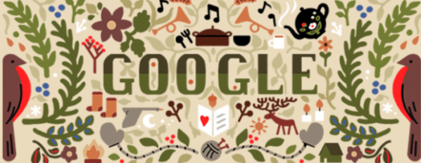 Авторы дудла пытались создать картинку, на которой виднелись бы главные, по их мнению, атрибуты рождественско-новогодних праздников. И это удалось сделать! На колоритном фото соединились веточки елки, снегири, праздничные носки для подарков, глиняная посуда, музыка, что символизирует колядки, перчатки, олени и другие изображения.