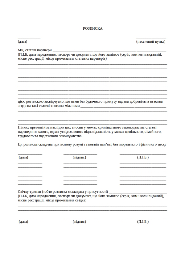 Пример расписки о добровольности половых отношений и освобождении от их последствий