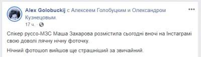 На снимок российской пропагандистки обратил внимание украинский политтехнолог Алексей Голобуцкий. «Спикер руссоМИД Маша Захарова разместила сегодня ночью в Инстаграмм свою довольно страшную ночную фоточку. Ночной фотошоп вышел еще страшнее обычного», - прокомментировал фото Марии Голобуцкий.