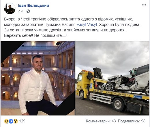 "Вчера (18 января, - прим. ред.), в Чехии трагически оборвалась жизнь одного из известных, успешных, молодых закарпатцев Пукмана Василия. Хороший был человек… За последние годы немало друзей и знакомых погибли на дорогах. Берегите себя!! Не спешите....!" – написал он.