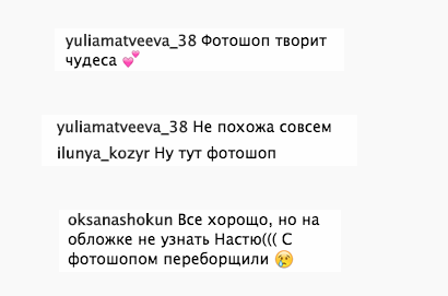 Фолловеры взялись критиковать: "Все хорошо, но на обложке не узнать Настю (((С фотошопом переборщили", "Ну здесь фотошоп", "Не похожа совсем", "Фотошоп творит чудеса".