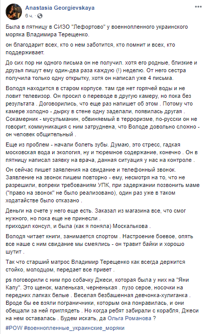 Об этом сообщила его адвокат Анастасия Георгиевская, посетившая моряка в пятницу, на своей странице в Facebook.