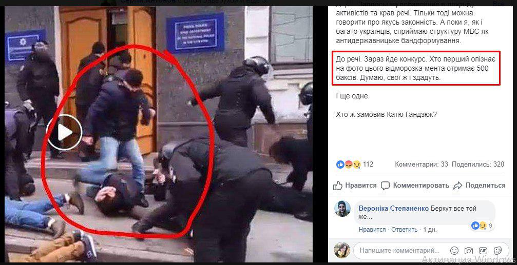 В соцсетях объявили конкурс: кто опознает полицейского, который жестоко избивал ногами лежачего активиста во время стычки в райотделении на Подоле. Тому, кто назовет его имя и адрес, обещают 500 долларов. Об этом пишет на своей странице в Facebook Сергей Антонов, пресс-секретарь организации Невідомий Патріот.