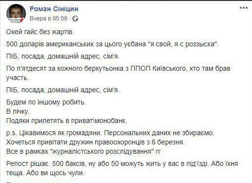 За информацию о других правоохранителях, которые также принимали участие в избиении активистов, готовы заплатить по 50 долларов. Об этом написал Роман Синицын, волонтер и бывший член комиссии по переаттестации полицейских. Позже стало известно, что против него открыли уголовное дело за пост с призывом сообщить ему персональные данные полицейских, избивших активистов около Подольского райуправления полиции Киева 9 февраля.