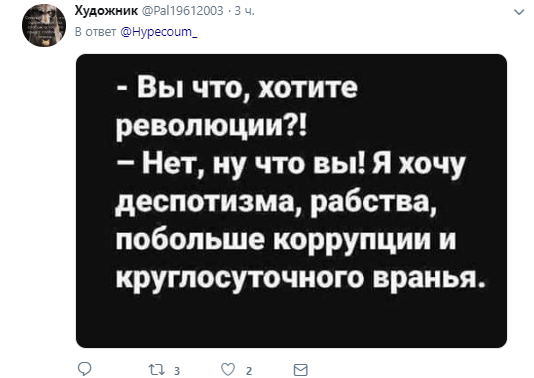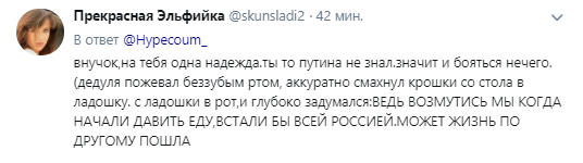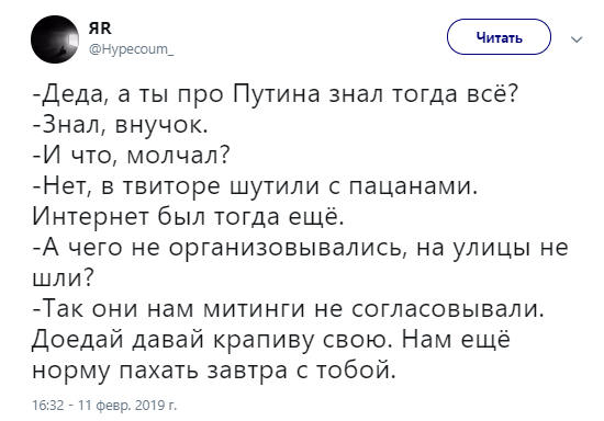"Деда, а ты про Путина знал тогда всё? - Знал, внучок. - И что, молчал? - Нет, в твиторе шутили с пацанами. Интернет был тогда ещё. - А чего не организовывались, на улицы не шли? - Так они нам митинги не согласовывали. Доедай давай крапиву свою. Нам ещё норму пахать завтра с тобой", - такого содержания текст написал блогер.