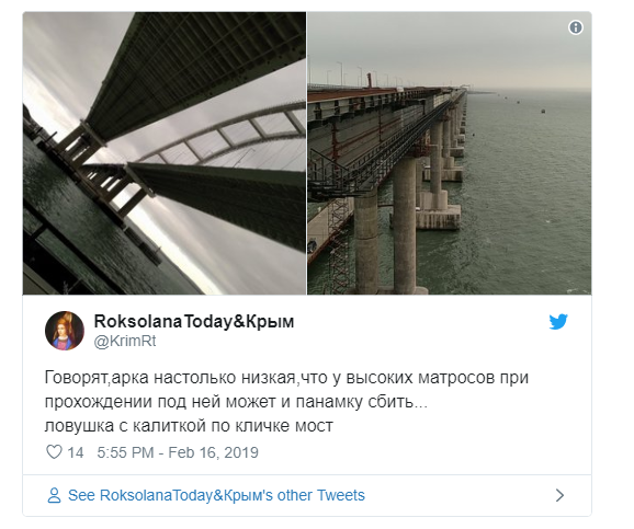 Мост оказался очень низким, что может помешать судоходству. Снимки были обнародованы на странице RoksolanaToday&Крым в Twitter.