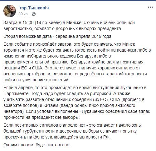 Об этих событиях повествовал в своем сообщении аналитик Украинского института будущего Игар Тышкевич. Если Белорусь решит провести досрочные выборы, это будет означать лишь одно, что Минск торопится и готов внести изминения либо в избирательный кодекс Беларуси, либо в правоприменительной практике. Стране крайне важен положительный отклик от стран ЕС и США. Такое сообщение написал Играр Тышкевич на своей странице в соцсетях. С его слов можно понять, что факт досрочных выборов может обозначать наличие положительных вестий от основных партнеров страны, и так же , скорее всего, определеннхз гарантий готовности пойти на улучшение состоявшихся отношений.