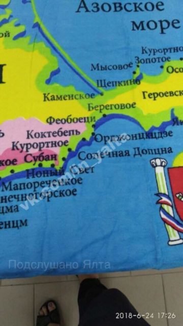 Подпись к прикрепленной фото гласит: «Мы не поедем этим летом в АПУПКУ?». Когда смотришь на эту карту, то даже страшно представить, кто мог НАСТОЛЬКО изуродовать названия городов на полуострове. Любому грамотному человеку данные названия будут резать глаз, так что сложно понять как этот «шедевр» смог попасть на полки магазинов.