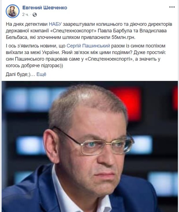 "И вот появились новости, Сергей Пашинский вместе с сыном спешно выехали за пределы Украины", - утверждает Шевченко.