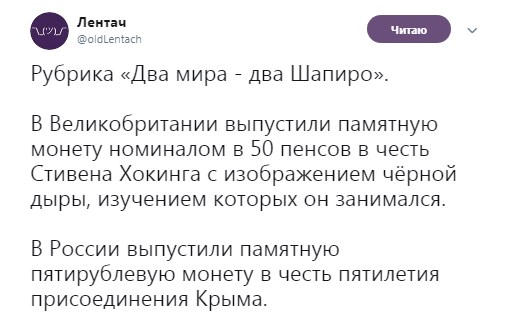 "Рубрика "Два мира - два Шапиро". В Великобритании выпустили памятную монету номиналом в 50 пенсов в честь Стивена Хокинга с изображением черной дыры, изучением которых он занимался. В России выпустили памятную пятирублевую монету в честь пятилетия присоединения Крыма", - говорится в подписи к фото монеты.