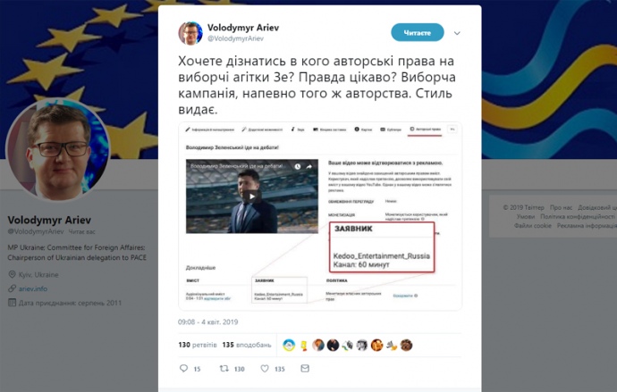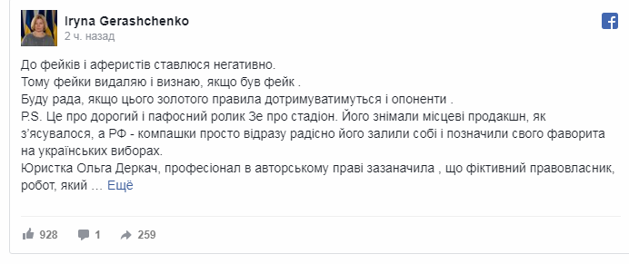 Первый вице-спикер Верховной Рады, которая избиралась от БПП, Ирина Геращенко и два депутата от БПП Мария Ионова и Владимир Арьев опубликовали посты, в которых утверждали, что корпоративные права на видеоролик Зеленского о дебатах на НСК "Олимпийский" принадлежат российской компании, - передает Украинская правда.