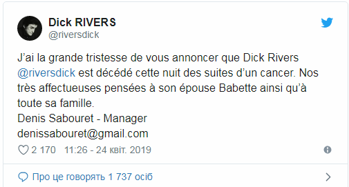 «С большой грустью сообщаю вам, что этой ночью от рака скончался Дик Риверc», — написал представитель музыканта.