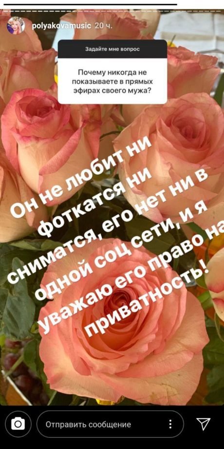Оля Полякова ответила на вопрос прямо. Певица объяснила,что он не любит фотографироваться и сниматься, а она в свою очередь уважает его мнение и не собирается нарушать его право на приватность.