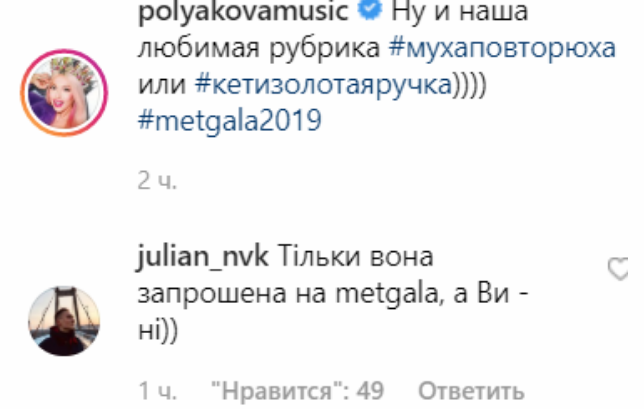 Бал прошел в нью-йоркском музее искусств Метрополитен, в это же время Оля Полякова обратила внимание на образ Кэти Перри. Дело в том, что известная певица вышла на красную дорожку в эпатажном платье серебристого цвета и с люстрой на голове. Само платье по виду напоминало еще большую люстру, украшенную множество драгоценных камней.