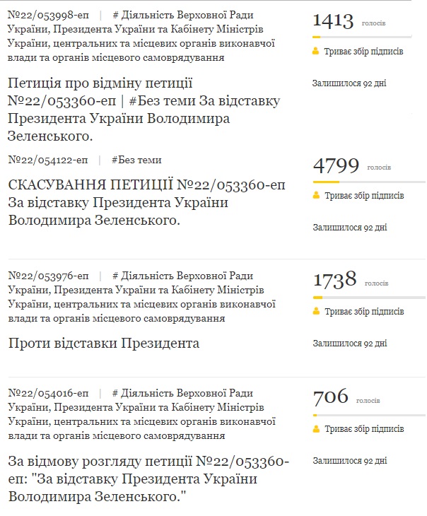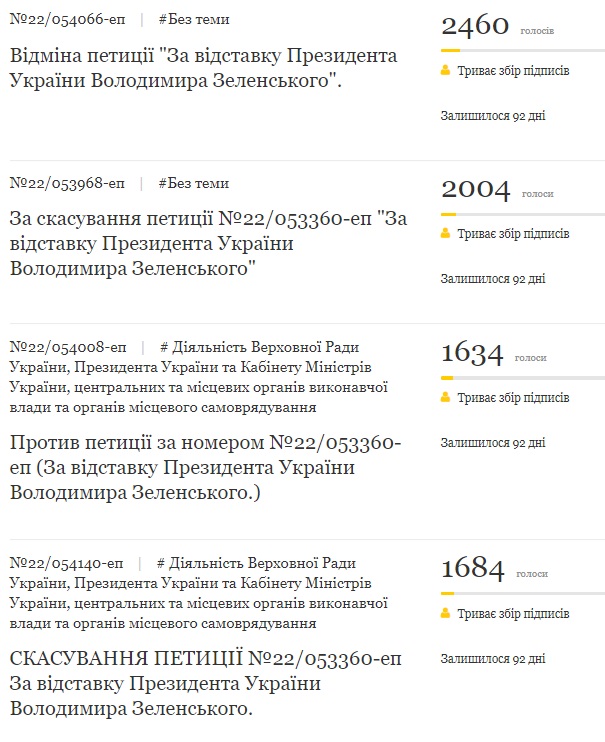 На сайте президента Украины появились десятки электронных петиций с требованием отклонить петицию за отставку Владимира Зеленского с поста главы государства. Как известно, эта петиция была опубликована 22 мая, и стремительно набрала необходимые для ее рассмотрения 25 тысяч голосов.
