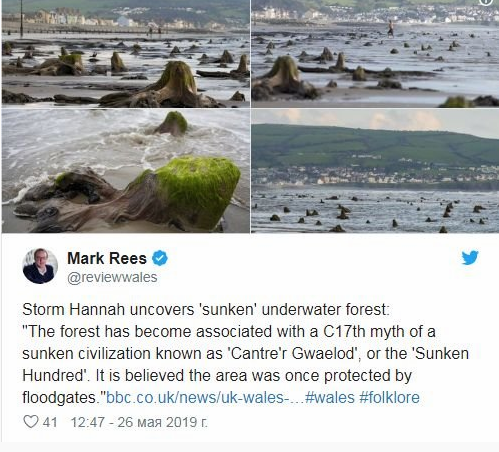 Ураган "Ханна" на западном побережье Уэльса (Великобритания) стал причиной появления доисторического леса, который был погребен под давлением воды и песка около 4,5 тыс. лет. Деревья ученые нашли между селами Борт и Инислас в графстве Кередигион.