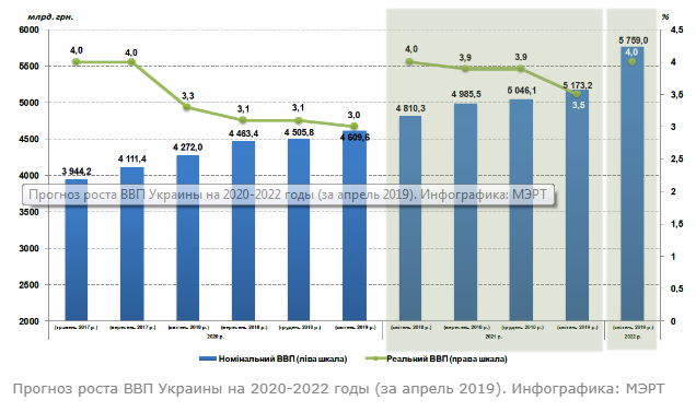 В конце апреля Национальный банк Украины сохранил прогноз по темпам экономического роста страны – в 2019 году рост ВВП ожидается на уровне 2,5%, в 2020 – 2,9%, а в 2021 – 3,7%.