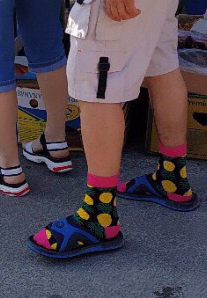 На снимке можно увидеть мужчину, который обут в шлепанцы и одет при этом в носки «веселенькой расцветки».