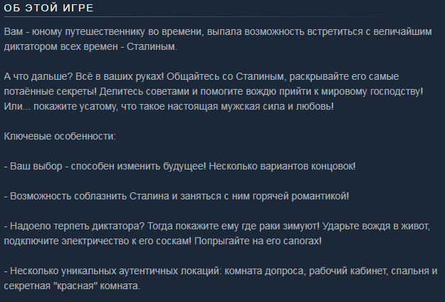 На популярной игровой площадке Steam появилось превью для новой игры под названием "Sex with Stalin":представители Коммунистической партии РФ и потомки Иосифа Джугашвили возмущены.