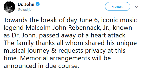 В США на 78-м году жизни скончался певец и композитор Доктор Джон (настоящее имя - Малкольм Джон Ребеннэк).