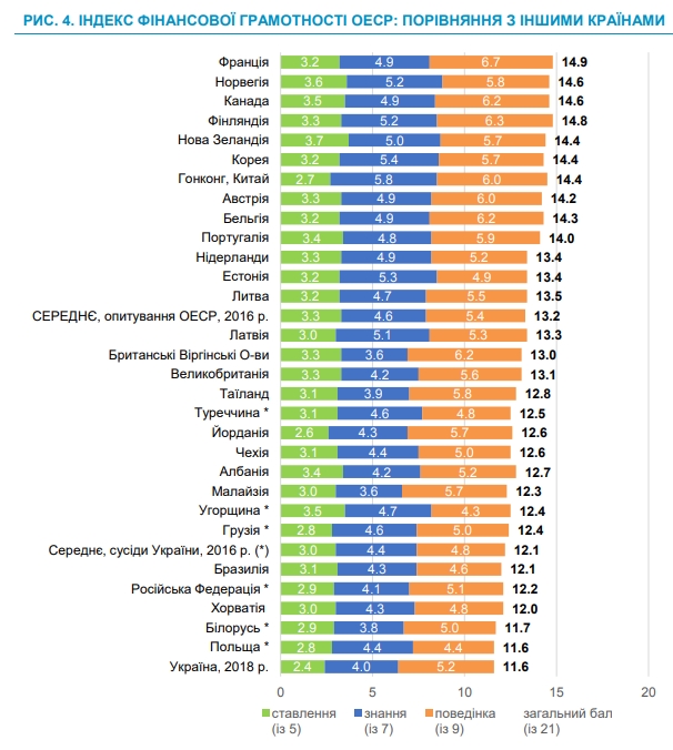 Данные показывают, что в Украине только 43% взрослого населения правильно ответили на минимум пять из семи вопросов на проверку знаний (что считается минимальным целевым показателем) против показателя 56% во всех странах, участвовавших в опросе ОЭСР в 2016 году.