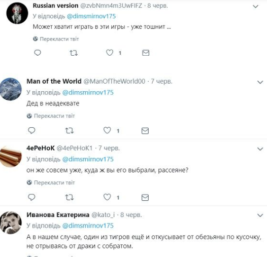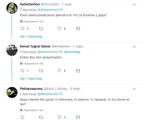 «Умная обезьяна — это он про себя, или как? А это не оскорбление представителя власти?)», «Руки самопроизвольно двигаются! Что за болезнь у деда?», «Деда совсем е*у дал) То обезьяна, то ракеты, то прорыв, то это были не мы!», «Дед в неадеквате», «Давно Россия стала обезьяной? А была сверхдержавой», — шутят они в комментариях.