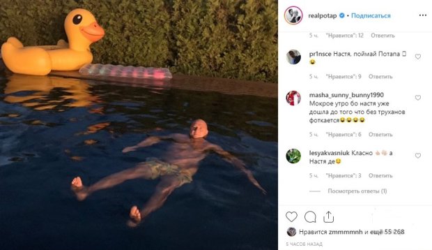 Подписчики Потапа тут же принялись шутить про его положение, подпись к фото и резиновую уточку, напомнив знаменитости утреннее обнаженное фото, которое появилось на странице Каменских.