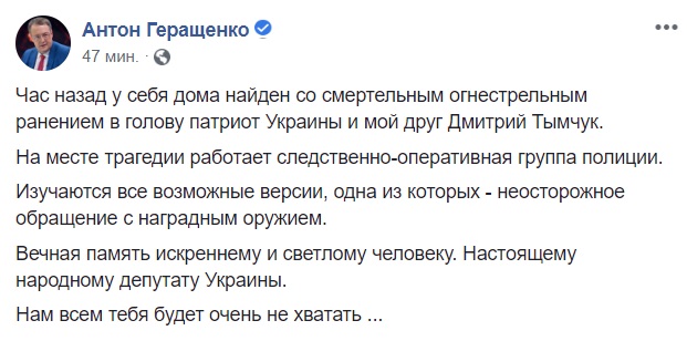 Самоубийство нардепа Тымчука: Антон Геращенко удалил из Facebook пост о соболезновании
