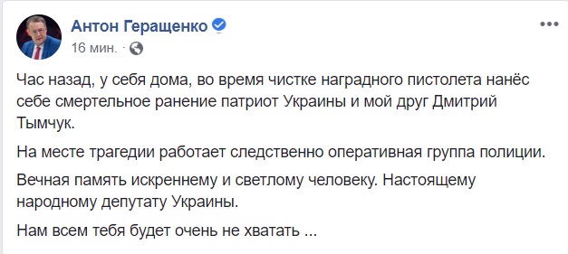 Самоубийство нардепа Тымчука: Антон Геращенко удалил из Facebook пост о соболезновании