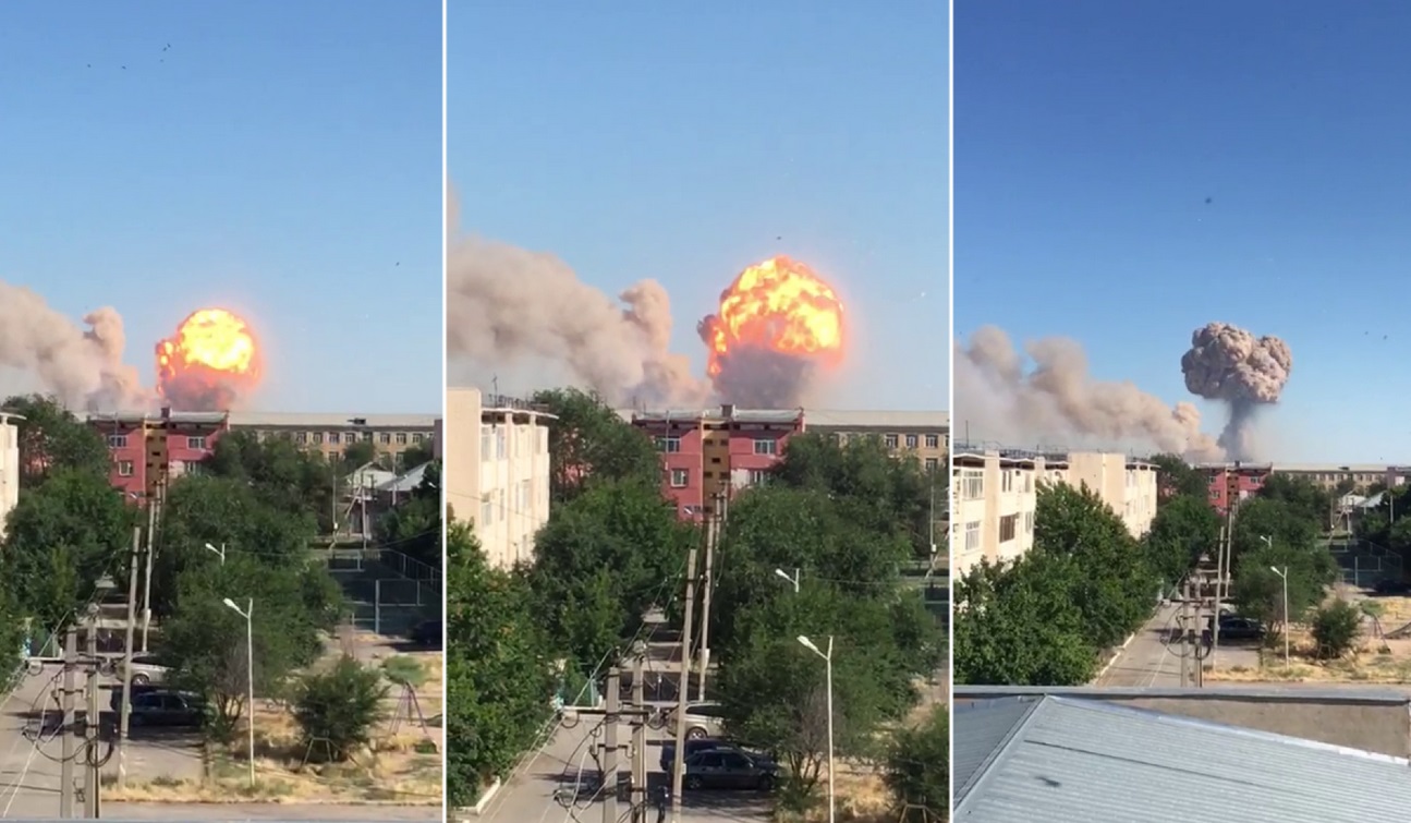 На одном из первых появившихся в Сети видеороликов из Арыси снято, как после взрыва ввысь поднимается грибовидный столб дыма, после чего взрывная волна достигает жилых кварталов.