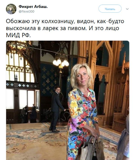 «Обожаю эту колхозницу, видон, как будто выскочила в ларек за пивом. И это лицо МИД РФ», — говорится в подписи.