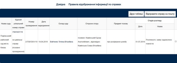 2 июля на сайте Подольского районного суда Киева появилась информация о том, что бракоразводный процесс состоялся, и супруги официально разведены. В графе «Состояние рассмотрения» дела истца Эдгара Каминского указано, что «Заявление удовлетворено полностью».