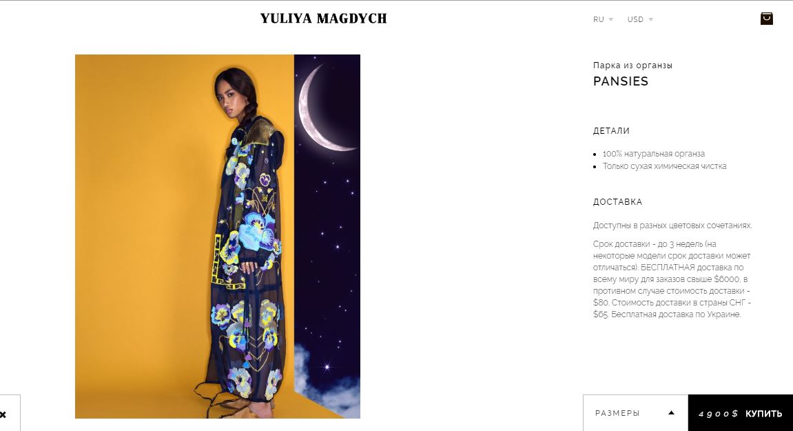Одежда из весенней коллекции 2018 года и называется Рansies (цветы "Анютины глазки" - англ). Парка выполнена из 100% органзы и стоит $4900 или 128380 гривен по курсу НБУ на 02.07.2019 года.