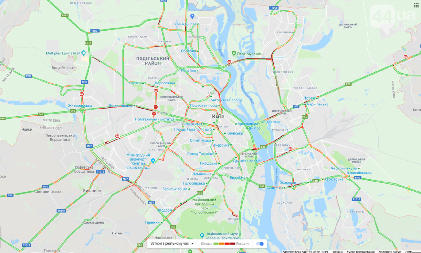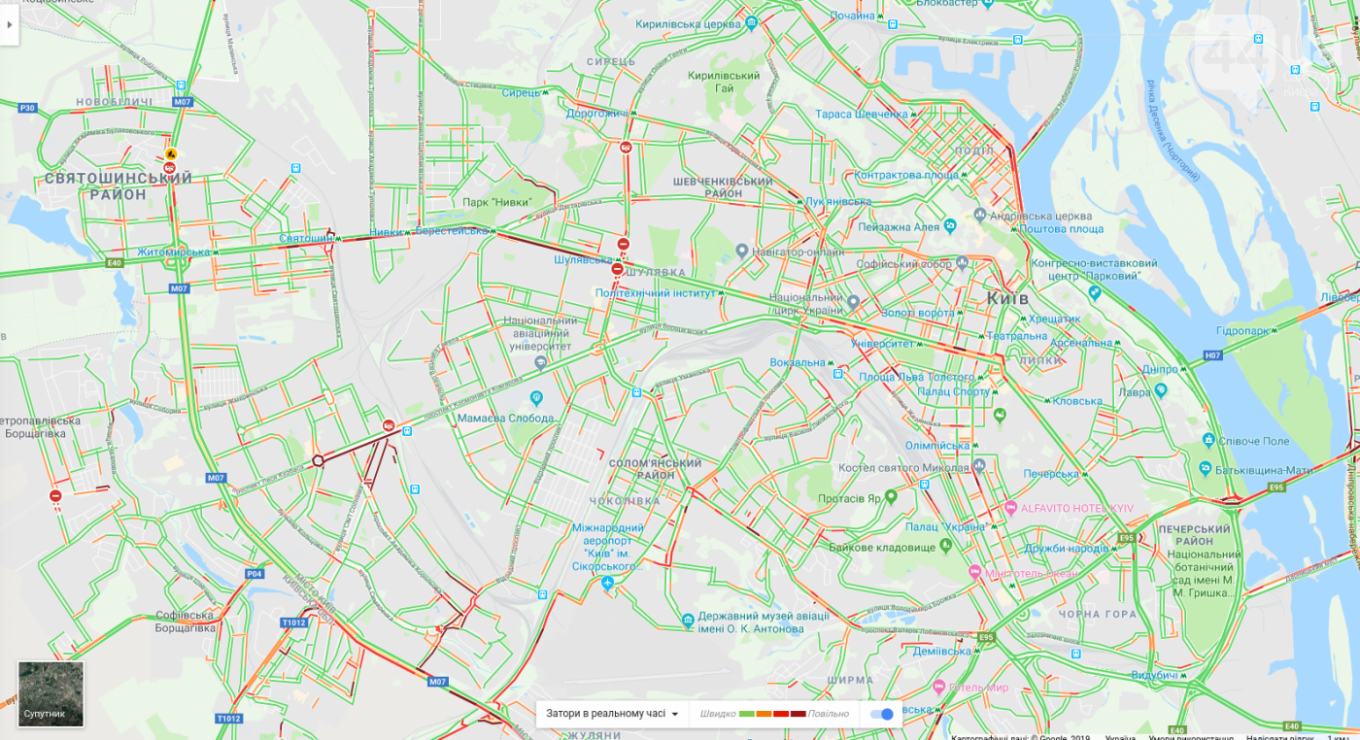 Как свидетельствуют данные онлайн-сервиса Google Maps, из-за продолжающегося строительства Шулявского путепровода серьезно усложнено движение на проспекте Победы.