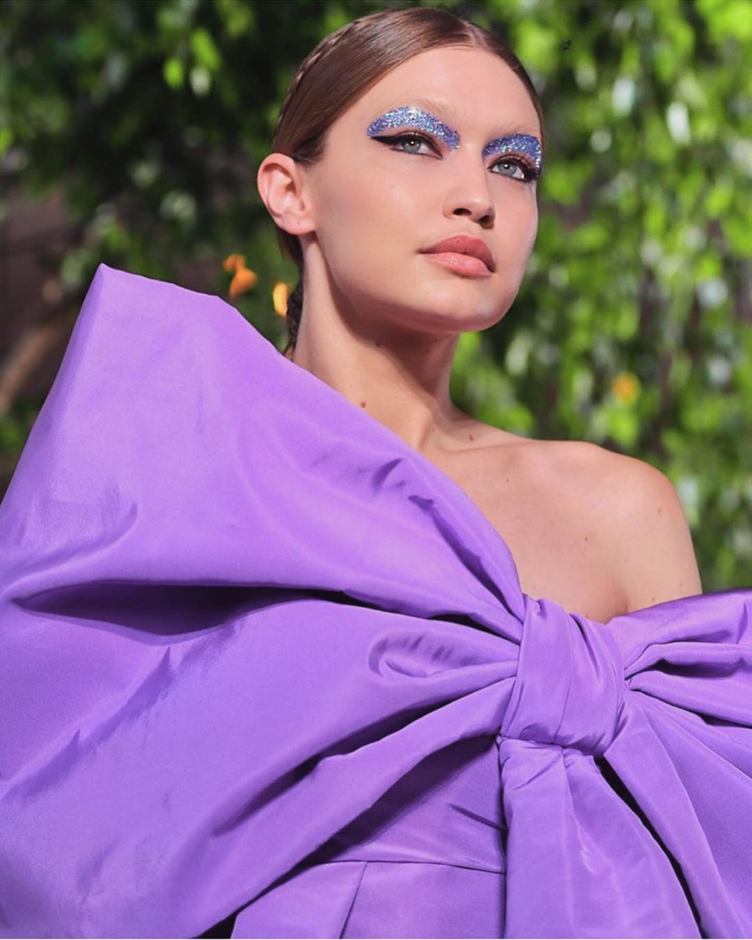 Стоит отметить, что лук Джиджи получился максимально гармоничным еще и благодаря слаженной работе бьюти-мастеров. Макияж и прическа, искусно выполненные лучшими визажистами и парикмахерами, также заслуживают высочайших похвал. Безупречный тон, выразительный взгляд густо подведенных глаз и широкие пурпурные с блестками полоски теней – все это сделало модель похожей на сказочную принцессу.