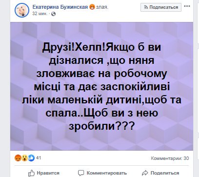 Друзья! Хелп Если бы вы узнали, что няня злоупотребляет на рабочем месте и дает успокаивающие лекарства маленькому ребенку, чтобы тот спал.. Что бы вы с ней сделали???" - написала Екатерина.