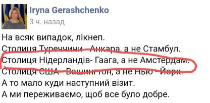 Потом появился отредактированный пост с поучениями. "На всякий случай, ликбез. Столица Турции — Анкара, а не Стамбул. Столица США — Вашингтон, а не Нью-Йорк. А то мало куда следующий визит. А мы переживаем, чтобы все было хорошо...", — отметила Геращенко.