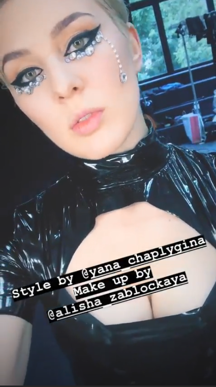 Так, снимками она поделилась в личных Instagram-сториз. На одном из них звезда традиционно позировала в латексной кофте с очень глубоким декольте.