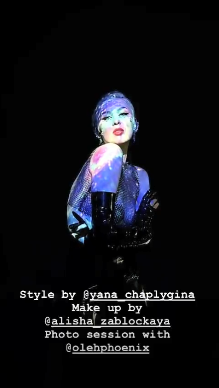 Третий образ певицы состоял из сетчатого прозрачного топа, латексных длинных перчаток и лосин.