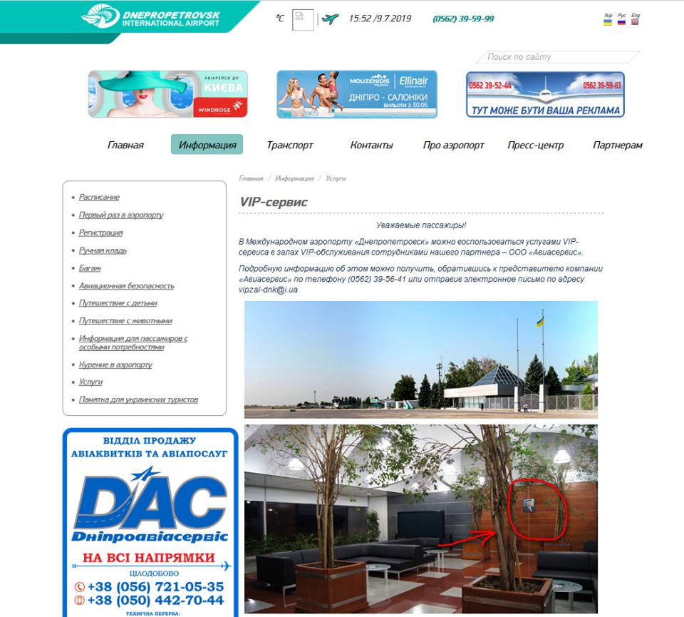 «В Международном аэропорту «Днепропетровск» можно воспользоваться услугами VIP-сервиса в залах VIP-обслуживания сотрудниками нашего партнера — ООО «Авиасервис», — сказано на официальном интернет ресурсе.