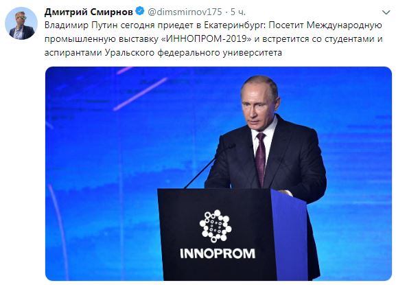 «Владимир Путин сегодня приедет в Екатеринбург: Посетит Международную промышленную выставку «ИННОПРОМ-2019» и встретится со студентами и аспирантами Уральского федерального университета», — говорится в публикации.