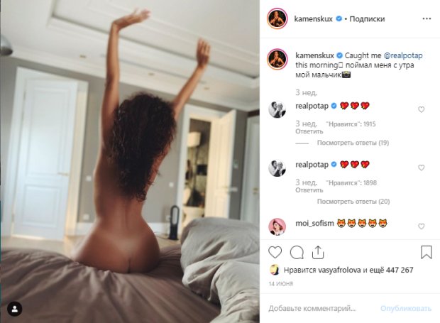 Так, на странице новоиспеченной супруги был опубликован пикантный снимок, на котором она запечатлена во время утреннего пробуждения. Примечательно, что в кадре звезда позирует совершенно обнаженной, а в подписи к посту Каменских пояснила, что в таком виде ее подловил Потап